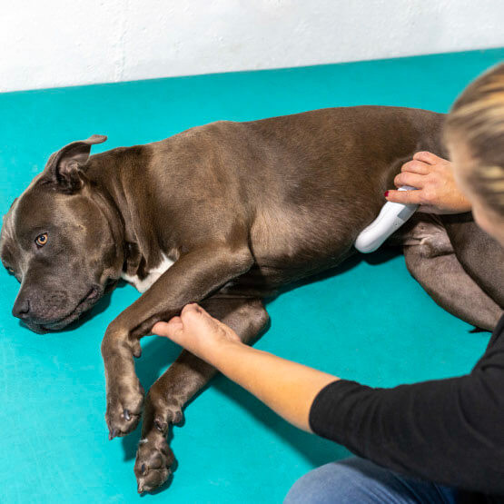 In Ruhe wird der Hund positiv und spielerisch daran gewöhnt, dass nicht jedes Gerät „der Feind“ ist und man immer eine positive Resonanz erhält, wenn eine Untersuchung durchgeführt wurde.